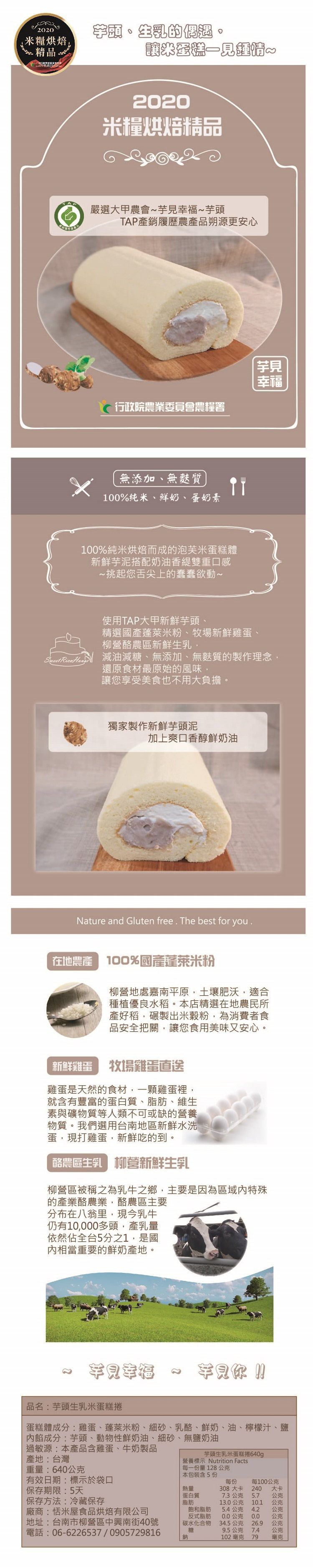 ➤100%純米烘焙而成的泡芙米蛋糕體,搭配清新爽口的奶油香緹,混搭著純真大甲芋頭,真正芋見幸福的好味道。